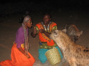 From Addis we took a 10-hour bus across the countryside to visit the city of Harar. Harar is the fourth holiest city in Islam, and the only walled city in Ethiopia. The wall is a UNESCO World Heritage Site. I believe there are 8 in total in Ethiopia, and we went to a few of them. The 10-hour bus ride was much better than the people vomiting near us mini bus ride of earlier in our trip. We even stopped in a very quaint town on the way for lunch and saw baboons along the roadside. That evening when we got to Harar we went to see one of the hyena men. These men sit outside of the city walls in the evenings and call hyenas from the surrounding countryside to them. They have even named the hyenas! Then they have the onlookers participate in feeding them. I will not lie. I was terrified at first at the thought of being so close to a hyena, but I decided that I could not be so close to such an interesting spectacle and not take part. So I put on my brave face and sat down by the hyena man. Then he broke a stick and put one end in my mouth and put a piece of meat on the other end. Then a hyena came up and ate the meat from the stick, coming closer to my face than I would have ever liked a hyena to come. I did this twice. Then Tristen, who had also done this, joined me and we fed a hyena together from a basket filled with meat scraps. It was probably one of the crazier things I have done in my life so far.