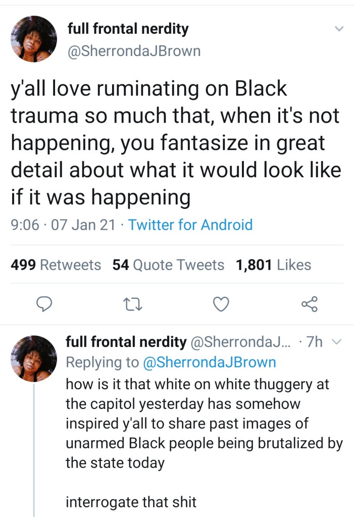 We know and have known the life and death disparity that skin color dictates when someone comes in contact with the police. We know that the police know how to not use force. We know that they hide behind a claim of fear to kill with impunity. None of that is new. It requires no new evidence. I read a few comments from Black voices that I follow online, and then traced that what I was experiencing and witnessing was the obsession with Black death. That even when it was not happening, folk had to imagine it because how could anything of terror be occurring in the U.S. without the presence and threatening of Black life. People were reposting threads of photos of violence against Black lives. Photos we’ve never asked to be archived and used whenever non-Black people felt compelled to use it in a point.