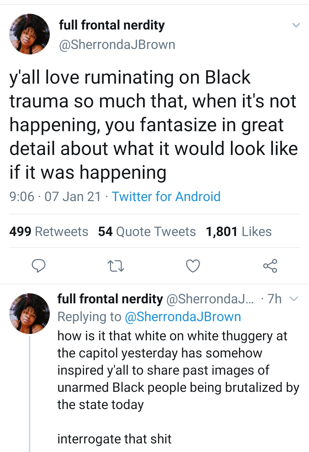 We know and have known the life and death disparity that skin color dictates when someone comes in contact with the police. We know that the police know how to not use force. We know that they hide behind a claim of fear to kill with impunity. None of that is new. It requires no new evidence. I read a few comments from Black voices that I follow online, and then traced that what I was experiencing and witnessing was the obsession with Black death. That even when it was not happening, folk had to imagine it because how could anything of terror be occurring in the U.S. without the presence and threatening of Black life. People were reposting threads of photos of violence against Black lives. Photos we’ve never asked to be archived and used whenever non-Black people felt compelled to use it in a point.